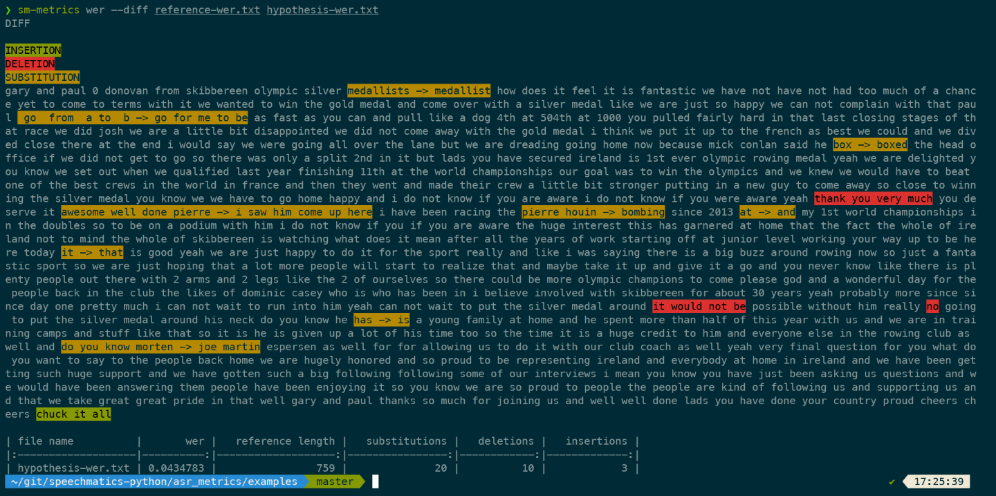 See below for an example output from the sm-metrics tool displaying the difference between the reference and hypothesis transcripts at a word level: